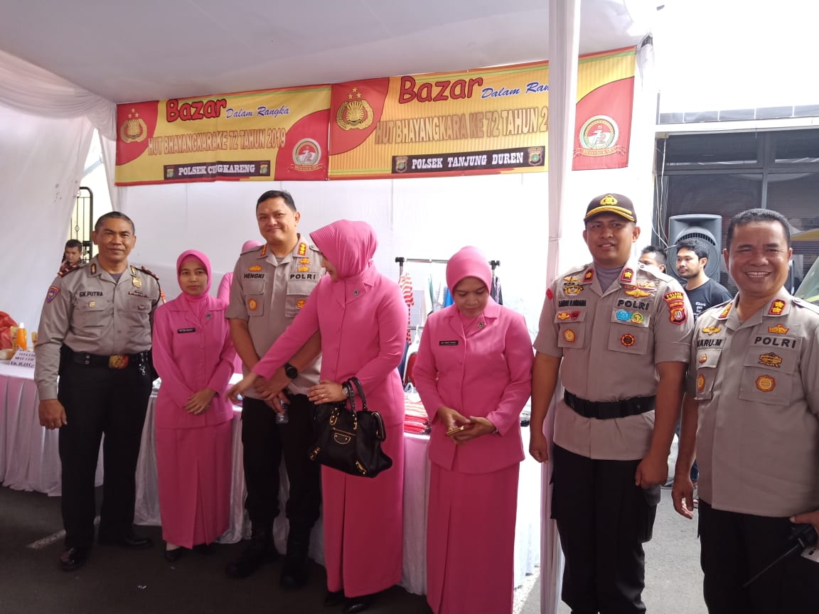 Dalam rangka Baksos (Bakti Sosial) menyambut HUT Bhayangkara ke 72 Tahun 2018, Ps. Kanit Binmas Polsek Tanjung Duren Ipda. GK. Putra, mendampingi Kapolsek Tanjung Duren Kompol Lambe Patabang Birana,SIK., mengikuti kegiatan Bazar di Polres Metro Jakarta Barat, berikut Aiptu Ismail dan Aiptu Sunarno, 2 Polwan, berserta 6 orang Ibu Bhayangkari Polsek Tanjung Duren.