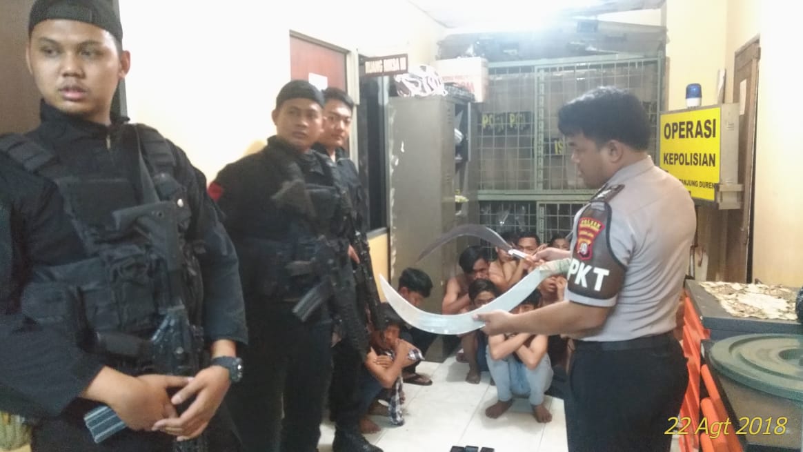 Tim Pemburu Preman (TPP) Polres Metro Jakarta Barat dibawah pimpinan Briptu Helmy mengamankan 15 remaja yang terlibat tawuran di Jalan Wijaya Kusuma, Grogol Petamburan Jakarta Barat, Rabu (22/08)