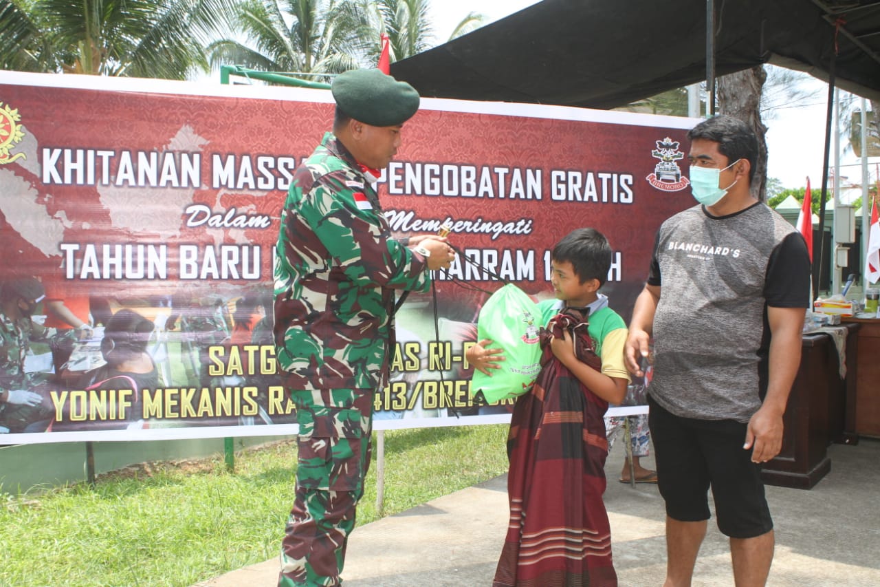 SIDIKPOST|(Jayapura). Dalam rangka memperingati Tahun Baru Islam 1 Muharram 1442 Hijriah, Satgas Pamtas RI-PNG Yonif Mekanis Raider 413 Kostrad menggelar khitanan massal dan pengobatan gratis.
