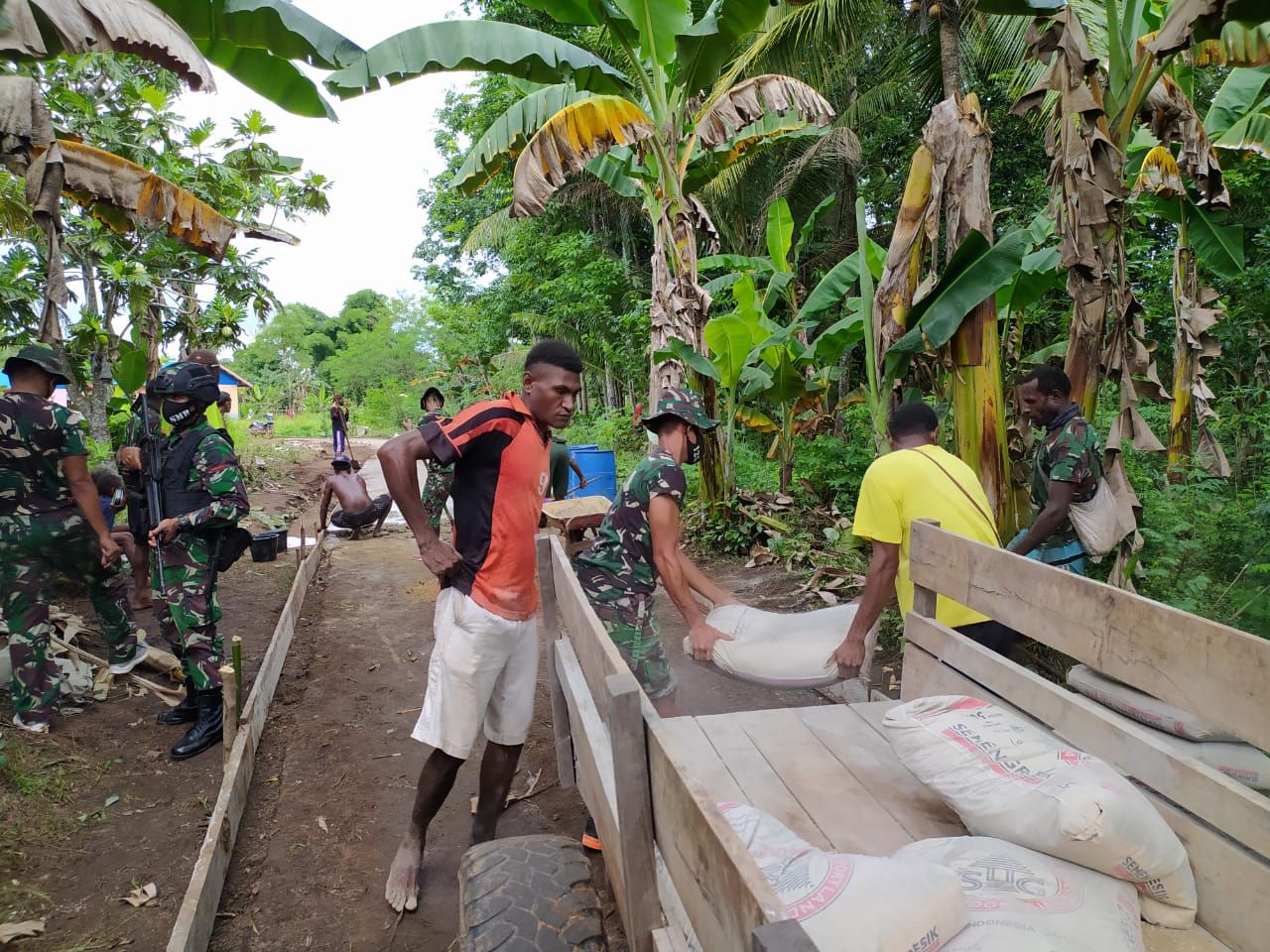 Dansatgas mengatakan, delapan orang personel Satgas dari Pos Toray dipimpin langsung oleh Danpos Letda Inf Bambang Suprapto bersama-sama dengan warga bergotong-royong dalam pengecoran jalan di RT 03 Kampung Toray.