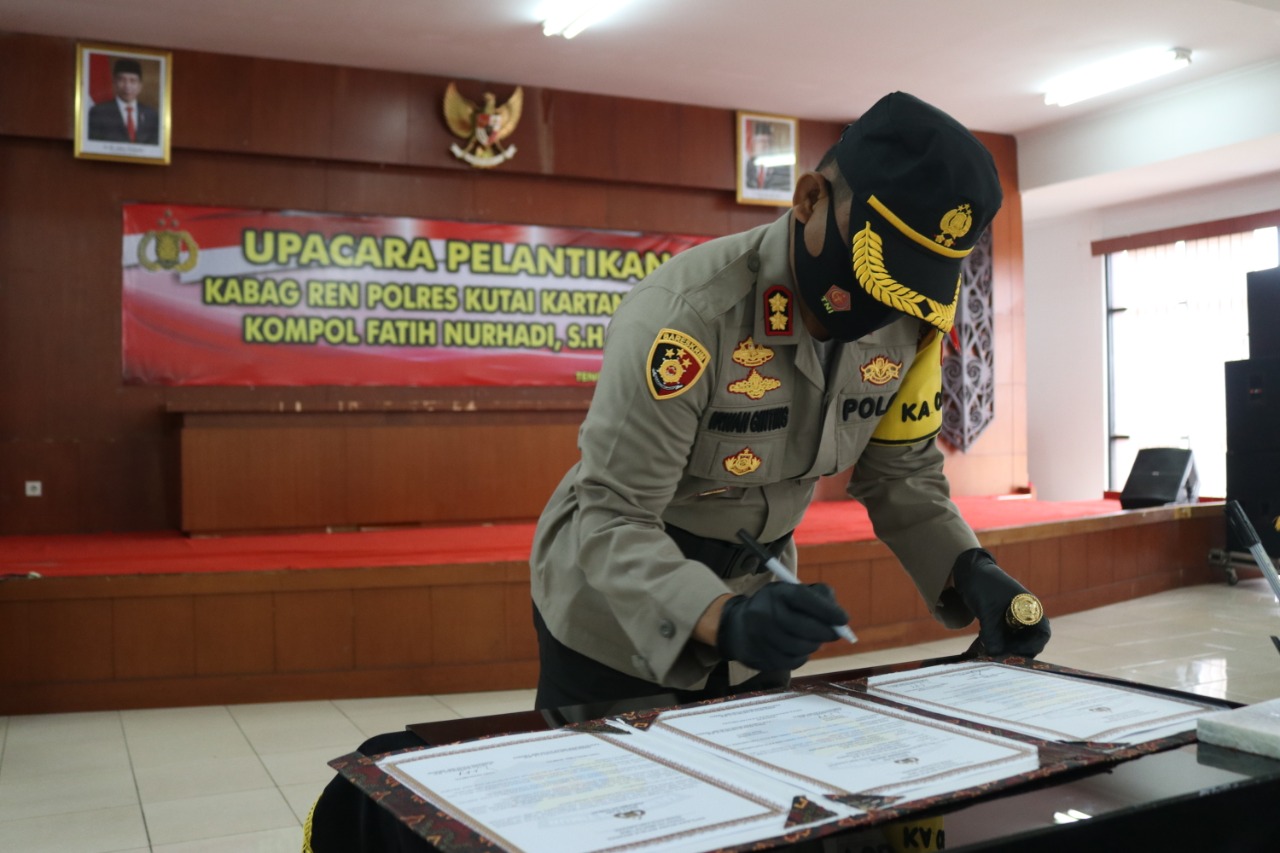 SIDIKPOST| Kukar – Bertempat di Ruang Catur Prasetya Polres Kukar, Senin (28/12) Siang, Kapolres Kukar AKBP Irwan Masulin Ginting memimpin upacara pelantikan Kabag Perencanaan Polres Kukar.