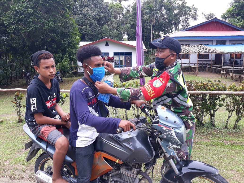 Serda Adi Biaksono mengatakan bahwa tak henti-hentinya menghimbau masyarakat binaannya untuk selalu mematuhi protokol kesehatan karena hal tersebut merupakan cara pencegahan penyebaran Covid-19 untuk saat ini. (Pendam XVII/Cenderawasih).
