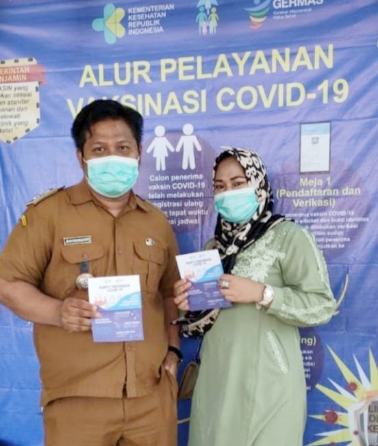 SIDIKPOST|Kab Tangerang—Satria S.Ip.,Kepala Desa Lemo Didampingi Oleh Iip Apriani Ketua TP PKK Desa Lemo Melaksanakan Kegiatan Acara Penyuntikan Vaksin Covid-19. Pada Senin 01 Maret 2021 Bertempat Di Puskesmas Tegal Angus Kecamatan Teluknaga Kabupaten Tangerang.(02/03/21)