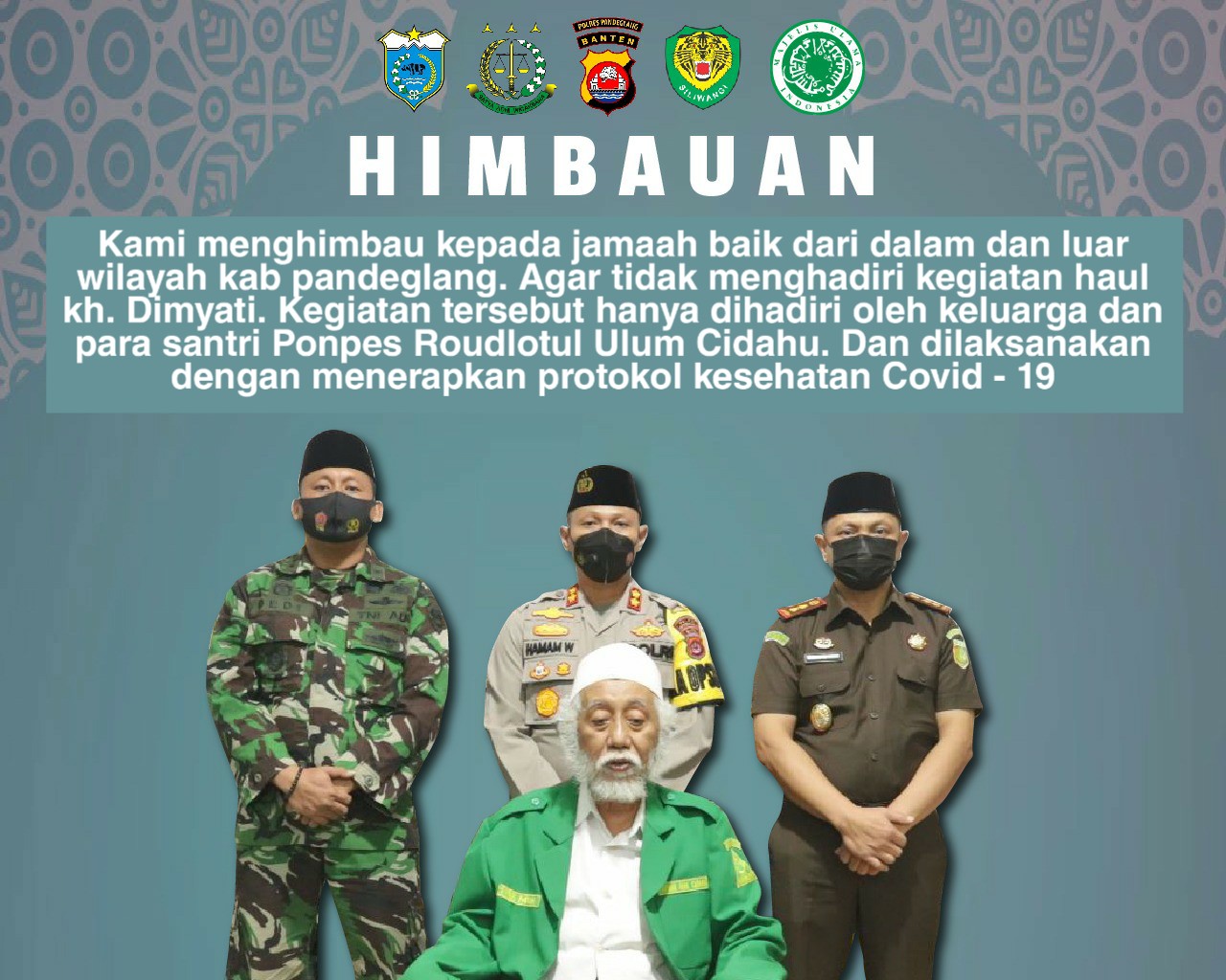 “Saya Abuya Muhtadi Cidahu beserta Forkopimda Kabupaten Pandeglang, sehubungan akan dilaksanakan haul Abuya Dimyati hanya akan dilaksanakan oleh keluarga dan santri dengan menerapkan protokol kesehatan yang ada,” kata Pengasuh Pondok Pesantren Roudhatul U’lum Cidahu, KH Abuya Muhtadi Dimyati, Kamis 18 Maret 2021.