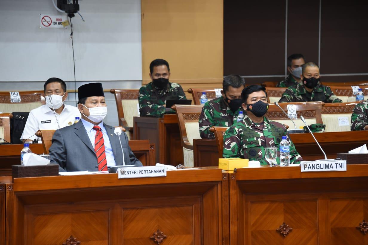 SIDIKPOST | (Puspen TNI). Panglima TNI Marsekal TNI Hadi Tjahjanto, S.I.P., bersama Menhan RI Prabowo Subianto, Kasad Jenderal TNI Andika Perkasa, Kasal Laksamana TNI Yudo Margono., S.E. M.M., Kasau Marsekal TNI Fadjar Prasetyo, S.E., mengikuti Rapat Kerja dengan Komisi I DPR RI yang dipimpin oleh Ketua Komisi I DPR RI Meutya Hafid, di Ruang Rapat Komisi I DPR RI, Jl. Gatot Subroto, Senayan, Jakarta Pusat, Rabu (2/6/2021). Dalam rapat yang berlangsung secara tertutup tersebut, Komisi I DPR RI dengan Kementerian Pertahanan dan TNI akan membahas tentang RKA dan RKP Kemhan/TNI tahun anggaran 2022.