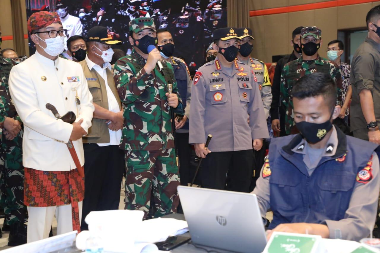SIDIKPOST | (Puspen TNI). Panglima TNI Marsekal TNI Hadi Tjahjanto, S.I.P., didampingi Kapolri Jenderal Pol Drs. Listyo Sigit Prabowo, M.Si. dan Kepala BNPB Letjen TNI Ganip Warsito, S.E., M.M., melaksanakan peninjauan Serbuan Vaksinasi di Grand Ballroom Sudirman, Bandung, Jawa Barat, Kamis (10/6/2021).