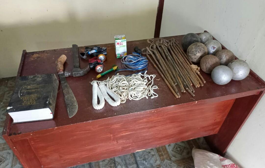 Pelaku berhasil diamankan dengan barang bukti 21 biji besi pasak, 8 besi tolak peluru, 1 piting lampu, 1 buah kabel listrik panjang kurang lebih 5 meter, 1 buah lampu listrik 10 watt merk laku dan juga barang bukti lainnya.