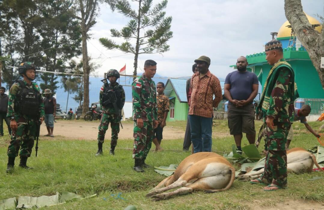 Usai melaksanakan Shalat Idul Adha, personel Pos Kotis Satgas Pamrahwan Yonif RK 751/VJS membantu masyarakat Distrik Walesi melaksanakan penyembelihan hewan qurban sebanyak 5 ekor sapi di halaman Masjid Al-Aqsho, yang dihadiri pula oleh Tokoh Masyarakat Suku Walesi H. Abu Hanifa Asso.