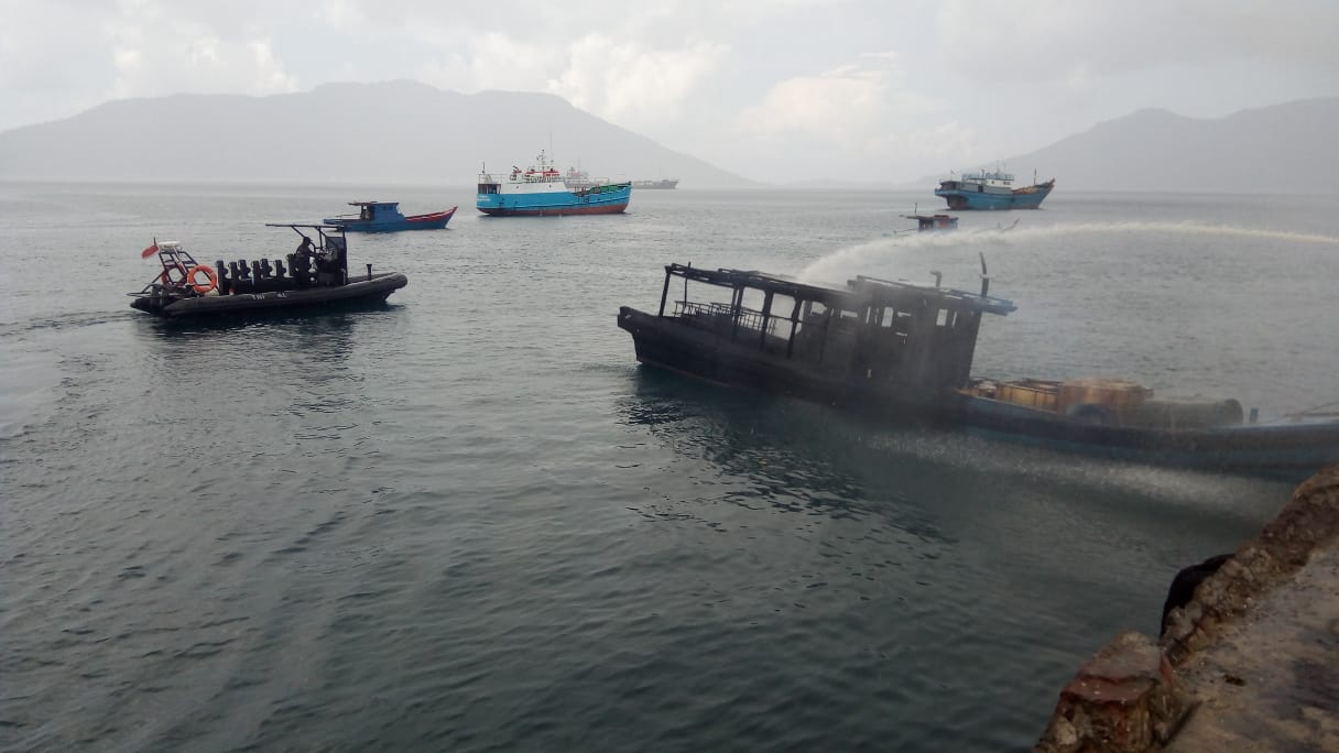 Prajurit Lanal Ranai Bantu Padamkan Kebakaran Kapal Di Dermaga Selat Lampa