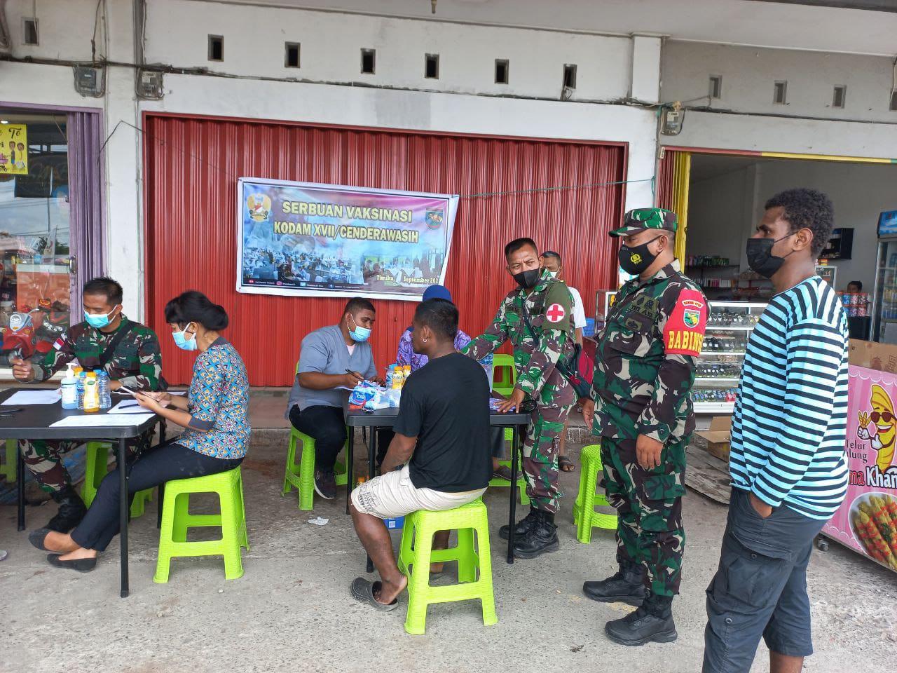 SIDIKPOST | (Timika). Aparat TNI dari Kodim 1710/Mimika Kodam XVII/Cenderawasih kembali melaksanakan vaksinasi mobile Covid-19, bertempat di Bundaran SP. 2 Jl. Cenderawasih, Distrik Mimika Baru, Kab. Mimika, Kamis (16/09/2021).